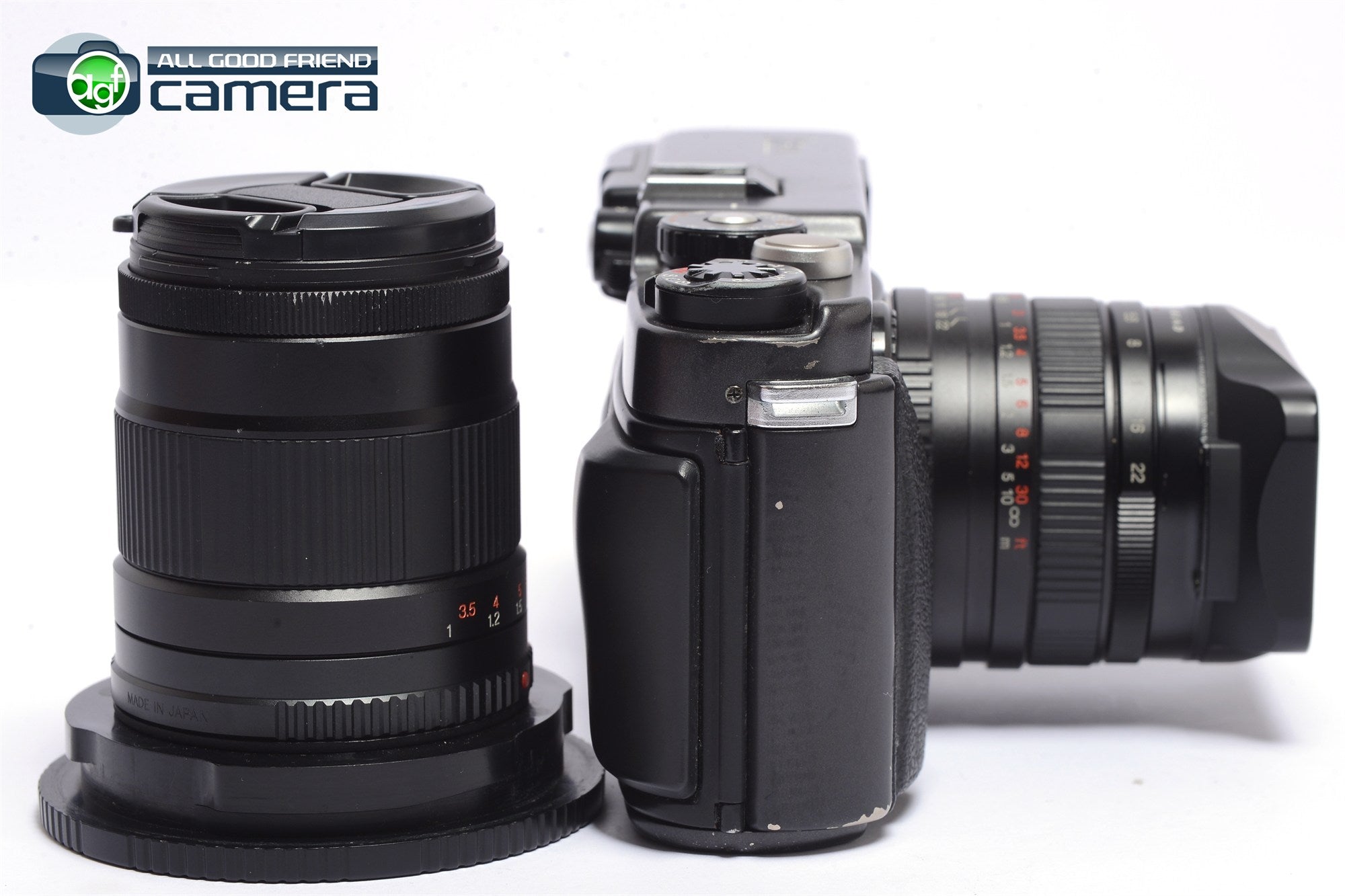 Cosmetic: GOOD --> there're paint wear and light scratches on and around the bottom plate. There're also some scratches on the aperture ring of the 90mm lens.