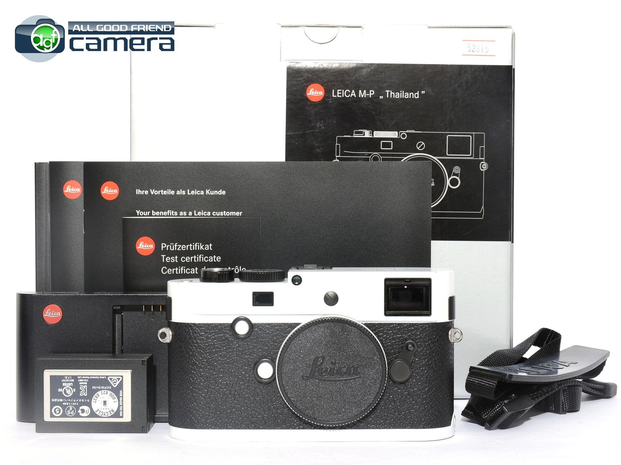 Includes: Outer paper box (will show some wear), box, presentation box, camera, body cap, battery, battery charger with power cords, neck strap, instructions manual, warranty card, test certificate.
